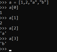 khi đó a sẽ là một danh sách gồm có 4 phần tử. Trong đó phần tử a[0], a[1], a[2], a[3] có giá trị tương ứng lần lượt là 1, 2, “a”, “b” .