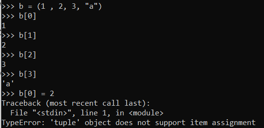 Ví dụ trên cho thấy khai báo và sử dụng một tuple như list thì được nhưng thay đổi giá trị một phần tử thì báo lỗi.