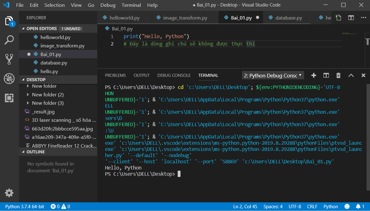 Kết quả vẫn không có gì thay đổi so với lần trước, bởi vì python hiểu dòng nào được đánh dấu # ở trước là dòng ghi chú và sẽ tự động bỏ qua.